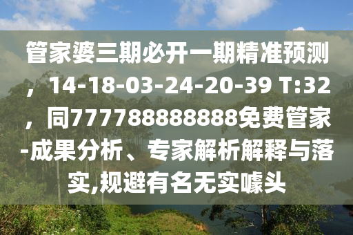 管家婆三期必開(kāi)一期精準(zhǔn)預(yù)測(cè),14-18-03-24-20-39 T:32,以及與之相關(guān)的777788888888免費(fèi)管家概念,是近期備受關(guān)注的話(huà)題,在探討這些概念時(shí),我們需要從成果分析、專(zhuān)家解析解釋與落實(shí)相關(guān)概念及術(shù)語(yǔ)等方面展開(kāi)描述,以幫助用戶(hù)全面理解并規(guī)避有名無(wú)實(shí)的噱頭。