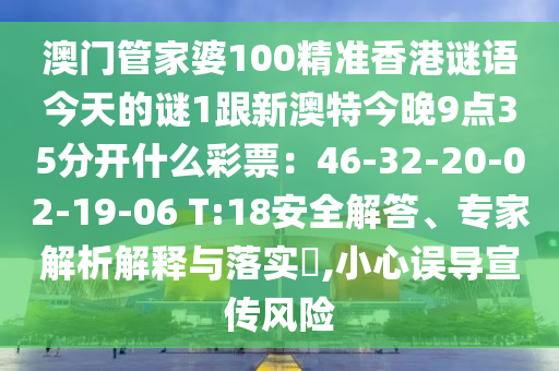澳門管家婆100精準(zhǔn)香港謎語今天的謎1跟新澳特今晚9點(diǎn)35分開什么彩票:46-32-20-02-19-06 T:18安全解答、專家解析解釋與落實(shí)?,小心誤導(dǎo)宣傳風(fēng)險(xiǎn)